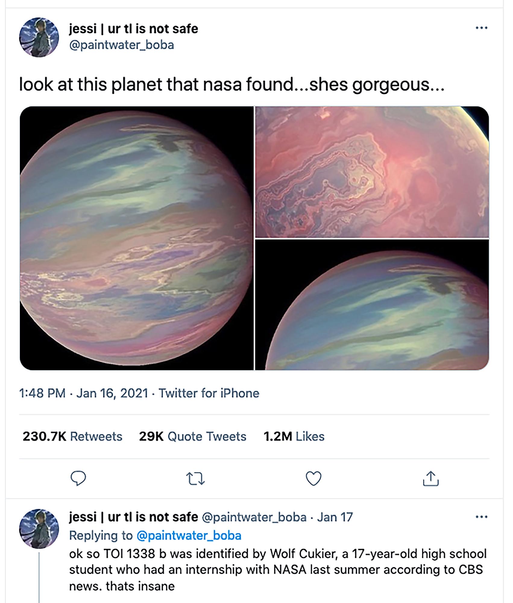 So, the “NASA photographs” of a new planet are fabrications. The story of Wolf Cukier, however, is fact. The 17-year-old did discover a new planet on day three of his two-month high school student NASA internship. “I was looking through the data for everything the volunteers had flagged as an eclipsing binary, a system where two stars circle around each other, and from our view eclipse each other every orbit. About three days into my internship, I saw a signal from a system called TOI 1338. At first I thought it was a stellar eclipse, but the timing was wrong. It turned out to be a planet.” Cukier’s find is indeed called TOI 1338 b. It is 6.9 times larger than earth and 1,300 light years distant, but it is unseen, its existence sensed by a gravitational wobble, and definitely unphotographed.
